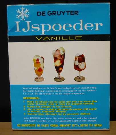 - BeschrijvingKartonnen verpakking met daarin De Gruyter ijspoeder vanille, van 115 gram. Op de voorkant staat een ijscoupe, op de achterkant staan drie ijscoupes en de bereidingswijze. Het pak is vol.