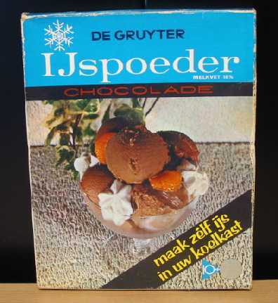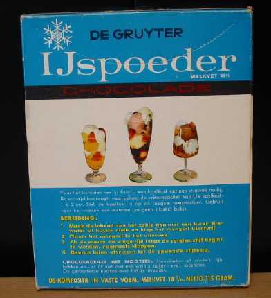 - BeschrijvingKartonnen verpakking met daarin De Gruyter ijspoeder chocolade, melkvet 18% van 115 gram. Op de voorkant staat een ijscoupe, op de achterkant staan drie ijscoupes en de bereidingswijze. Het pak is vol.