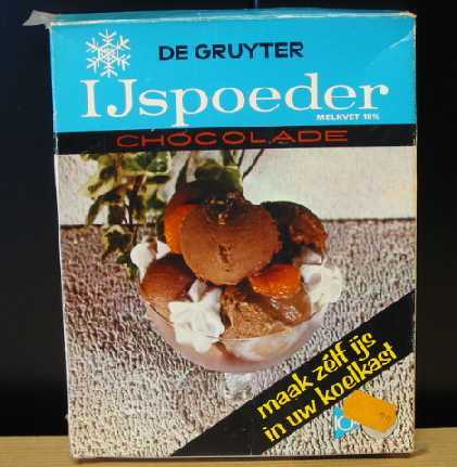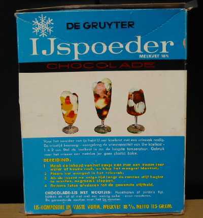 - BeschrijvingKartonnen verpakking met daarin De Gruyter ijspoeder chocolade, melkvet 18% van 115 gram. Op de voorkant staat een ijscoupe, op de achterkant staan drie ijscoupes en de bereidingswijze. Het pak is met plakband dichtgemaakt. Het pak is leeg.