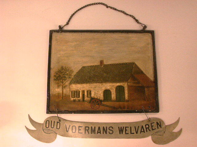 - BeschrijvingVoorstelling: voorgevel van boerenwoning met schuur en handkar op de voorgrond. Voorstelling achterzijde: achtergevel van boerenschuur met huifkar. Opschrift op afzonderlijk ijzeren banderollen aan haken bevestigd: OUD VOERMANS WELVAREN/M. van Dun. Afkomstig uit Vught.