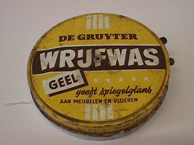 - BeschrijvingMetalen blik De Gruyter wrijfwas, geel. Het blik bestaat uit twee delen die door middel van een koperkleurige draaiknop van elkaar gaan. Het bovenste deel is hoofdzakelijk geel, het onderste deel is cremekleurig. Het blik is deels vol.