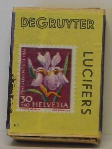 - BeschrijvingLege kartonnen met houten verpakking voor De Gruyter lucifers met een afbeelding van een postzegel waarop paarse bloemen staan afgebeeld. De postzegel is afkomstig uit Helvetia.