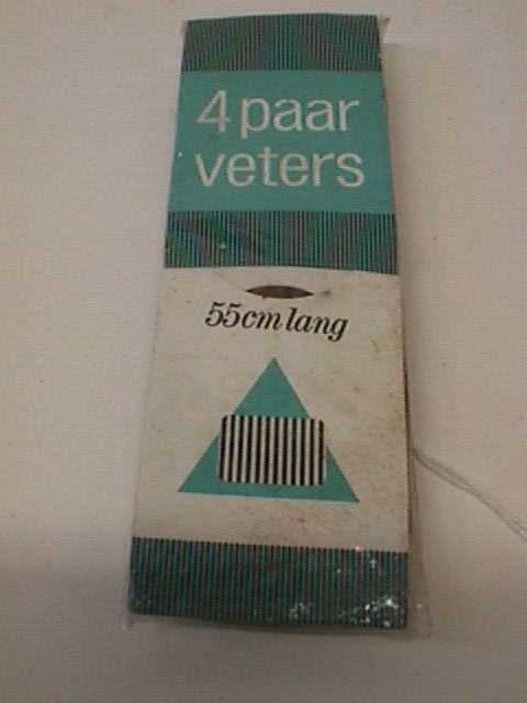 - BeschrijvingDoorzichtig plastic verpakking met daarin een groen met wit gekleurd stukje karton. Op het karton staat tekst.In de verpakking zitten bruine veters. Op de onderkant zit een prijssticker.