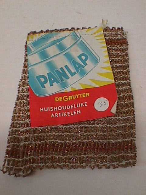 - BeschrijvingGewoven lap van draden en ijzerdraad. De kleuren zijn, wit, bruin en rood. Er zit een stukje papier opgestikt, rood/geel papier met een afbeelding van een pan en de prijs. Voor de prijs staat het 10 % teken van de Gruyter.