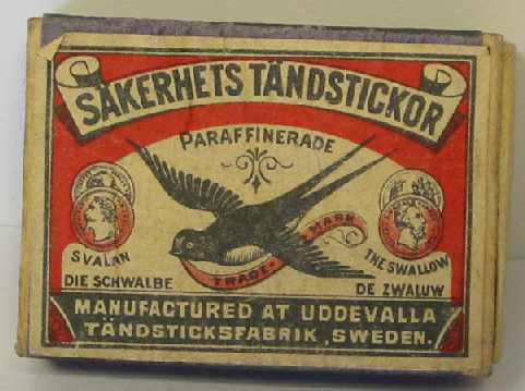 - BeschrijvingKartonnen met houten verpakking voor lucifers. Op de voorkant van het doosje staat een zwaluw op een gelige met rode achtergrond. De achterkant is paars, de zijkanten bruin. Het doosje is leeg.