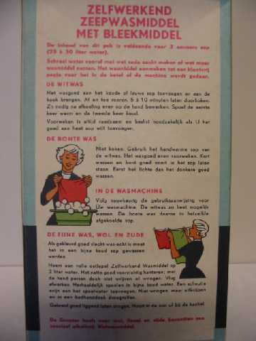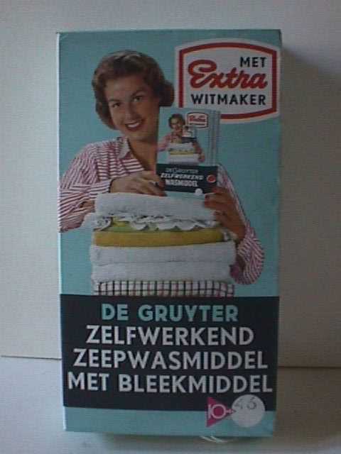 Blauwe doos. Op de voorkant staaen afbeelding van een vrouw met bruin haar die op een stapel gevouwen wasgoed leunt en in haar hand een pak wasmiddel houdt. In een stip onderaan rechts staat de prijs voor het 10 % teken van de Gruyter. Op de zijkanten staat se slogan van de Gruyter. Op de achterkant staat een uitgebreide gebruiksaanwijzing met afbeeldingen van een vrouw die de was doet.