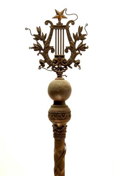 - BeschrijvingBehorend bij vaandel met inv.nr. 1625. De gehele stok is voorzien van goudkleurige metalen bekleding en versiering, waaronder goudkleurige metalen takken en goudgalon. Verder versierd met groen fluweel en rode bandjes. Stokbekroning: lier, waarboven 5-puntige ster en omgeven door takken met besjes. Behorend bij inv.nrs. 11.463 en 11.464 ?