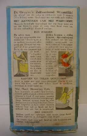 - BeschrijvingBlauwe doos. Op de voorkant staaen afbeelding van een vrouw met blond haar die een stapel gevouwen wasgoed in haar armen heeft. Op de bovenkant staat de slogan van de Gruyter. Op de achterkant staat een uitgebreide gebruiksaanwijzing met afbeeldingen.