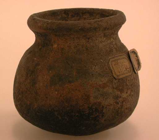 - BeschrijvingVan grauwe aarde en onverglaasd van onderen geheel kogelvormig zonder enig spoor van poot of rand boven aan de schuins toelopende hals is een eenvoudige rand om de opening -ronde bodem -ronde buik -insnoering onder mondrand -schuin naar boven lopende mondrand -ongeglazuurd, rood/zwart gevlekt