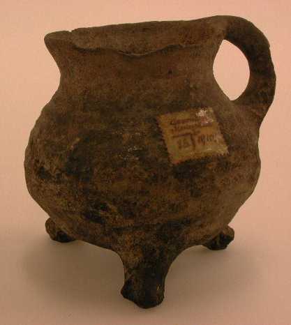 Type als inv.nr. 01694. Met drie poten en een oor, de buik versierd met witte strepen -lensvormige bodem -3 klaverbladvormige voetjes -bolvormige buik met draairingen -gladde wijd uitlopende hals en mondrand -worstoor aangezet op buik en mondrand -gedeeltelijk bruin/oranje loodglazuur -versierd met halfronde strepen in gele slib op hals en schouder