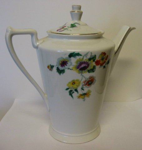 Bekervormige porseleinen koffiepot. Het deksel is wit met een gouden randje, ook om het handgreepje zitten 2 gouden randjes. Op de bovenkant staat 2 keer een afbeelding van bloemen. Op de pot staan op de zijkant 4 groepen met bloemen afgebeeld en de rand is goud gekleurd.Ook de randen van de tuit en het oor hebben een gouden lijn. Op de onderkant van de pot staat een klein groen bloemetje.