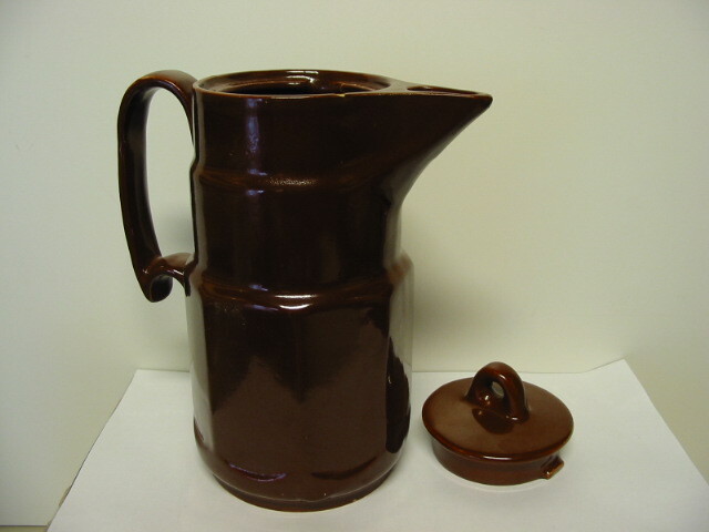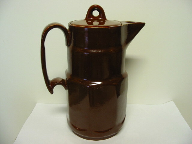 - BeschrijvingAardewerken, donkerbruin geglazuurde kan voor koffie- of chocolademelk De kan heeft een deksel. Het middenstuk van de kan is achthoekig en de tuit is in de vorm van een driehoekige sneb.