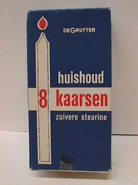 - BeschrijvingBlauw doosje met inhoud. Op de voor-, achter-, linkerzij en rechterzijkant staat een witte kaars afgebeeld. Op de linker- en rechterzijkant staat de slogan van de Gruyter in een cirkel.