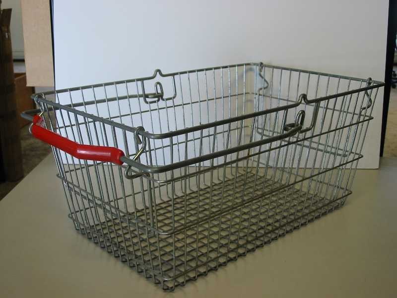 Metalen winkelmandje met een liggend, schanierend hengsel. Aan de bovenkant van het hengsel zit een rood kunststof handvat.