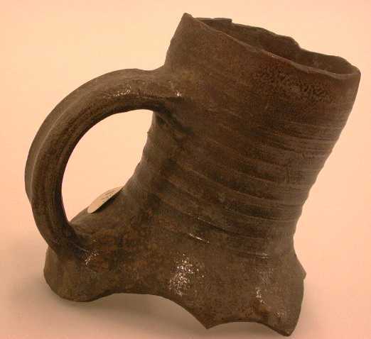 - BeschrijvingSlechts het bovengedeelte van een kan. Schouder overgaand in hoge cylindrische hals, van boven iets uitlopend -bandvormig oor aangezet op schouder en onder mondrand -donkerbruin zoutglazuur -aan de binnenkant van de hals is aarde vastgesinterd