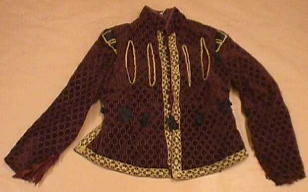 Jas van donkerrood fantasiefluweel. De randen van het lijfje zijn versierd met goudkleurig stiksel. Sluiting met bolronde knoopjes met glittertjes. Bovenkant voorzijde: vier keer opengewerkt met goudkleurige rand, opgevuld met gladde purperkleurige stof over de schouders en zwarte gladde stof met randjes van goudkleurig stiksel. Voering van donkerrode keperzijde. Splitten in de jas zijn afgewerkt met goudband. Op taillehoogte tien zwarte strikjes. Dit kostuum werd gedragen door jonkheer M.C. van Rijckevorsel tijdens de maskerade van het Leidse studenten-corps in 1910. Deze maskerade had als thema 'De blyde incomste van syne hoogheyt Frederick Hendrick, vergese schapt van haare majesteyt Henriëtte Maria, coninginne van Groot-Brittanien'. Mr. Johannes Polyander genaamd Van den Kerckhoven, was heer van Kerckhoven, Heenvliet en Sassenheim, Luitenant-Houtvester, Groot-Jagermeester en Groot-Valckenier van wege de Ed. Groot Mog. Heeren Staten van Holland en West-Friesland, Superintendant van het Hof en de Affaires van H.K.H. Maria, Prinses van Engeland, Prinses Douarière van Oranien.