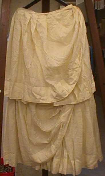 - BeschrijvingCrêmekleurige middag(?)japon. Het lijfje is geplooid en heeft een katoenen binnenlijfje. De losse rok is een geplooide wikkelrok met overslag, in twee etages.