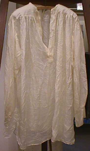 Crêmekleurige blouse met parelmoeren knoopjes. Damessluiting aan de hals en brede manchetten.