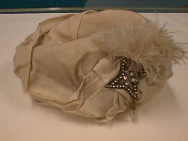 - BeschrijvingEen witte tulband versierd met een witte struisveer en een stervormig fantasiesieraad met steentjes.