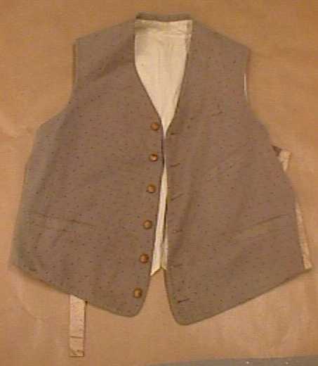 - BeschrijvingEen beige visgraat vest met een donkerpaars spikkeltjesmotief. Op het vest zes knopen van zijden garen met patroontje, die met de hand gemaakt zijn. De voering is wit en het achterpand is van glanzende roomwitte stof.