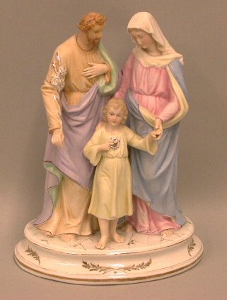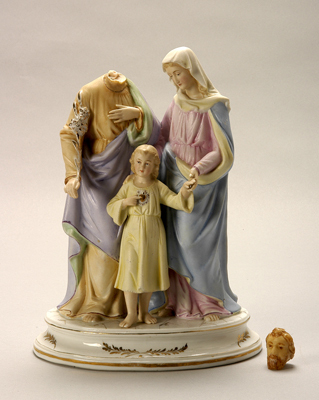 - BeschrijvingBeeld voorstellende Jozef, Maria en Jezus op een witte ovale voet. De figuren zijn gehuld in pastelkleurige gewaden. De voet is versierd met goudverf.