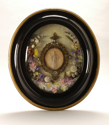 - BeschrijvingEen Agnus Dei omringd door een metalen filigrainversiering met rode (robijn?) en blauwe (turkoois) edelstenen en zestien parels. Rond de versierde Agnus Dei een rand van kunstbloemen en blaadjes in de kleuren wit, roze, lila, bruin, geel en groen.