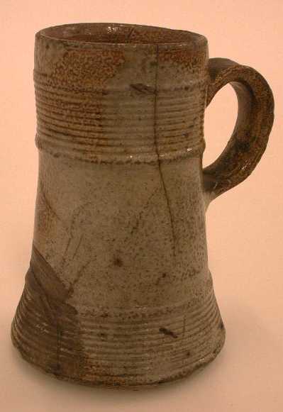 Snel drinkbeker van grijze aarde, grijs en bruin verglaasd de voet breed uitlopend met oor om voet en hals geprofileerd met blauwe ribbels. Inlands of Raerens aardewerk? - konisch model - vlakke bodem - ringen aan voet en aan mondrand - een bandoor aangezet op lichaam en onder mondrand - bruin/grijs gevlekt zoutglazuur - de indrukken aan oor en mondrand zijn waarschijnlijk afkomstig van een tinnen deksel