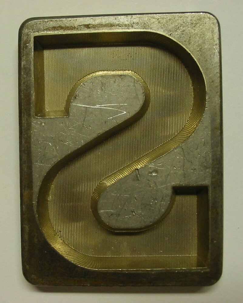 - BeschrijvingRechthoekige metalen vorm bestaande uit een plat vlak met daarin de letter S uitgediept.