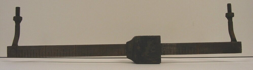 - BeschrijvingEen schuif waarmee je het gewicht kan aangeven. Een metalen blokje schuif je over een metalen staaf heen, waarop gewichten gegraveerd zijn. Aan linker- en rechterzijde zitten scrhoeven met moertjes.
