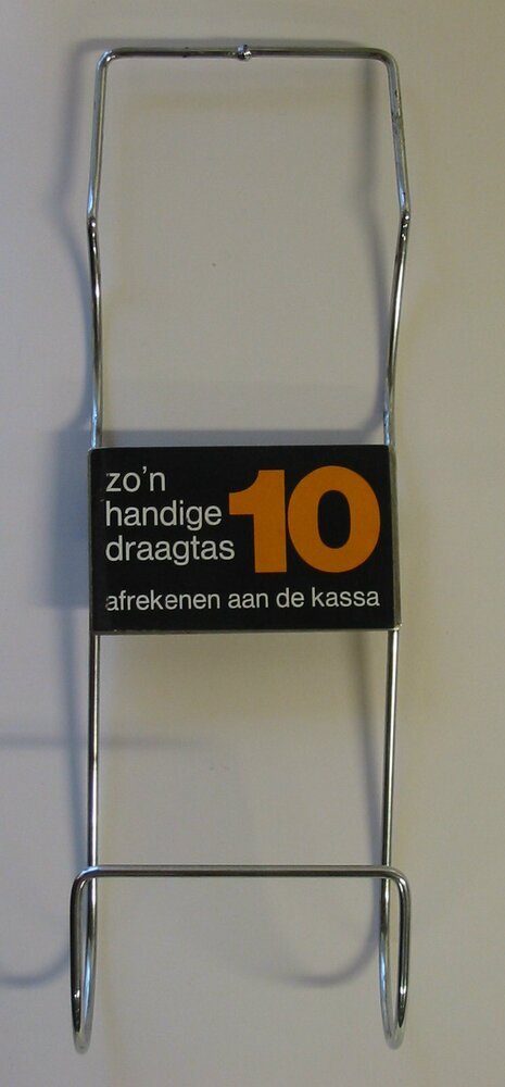 - BeschrijvingMetalen draagtassenhouder met plaatje in het midden. De houder zelf bestaat uit een stuk en is aan de bovenzijde aan elkaar gemaakt. Het plaatje is erop gesoldeerd. Op het tekstplaatje zit een zwarte sticker met tekst.
