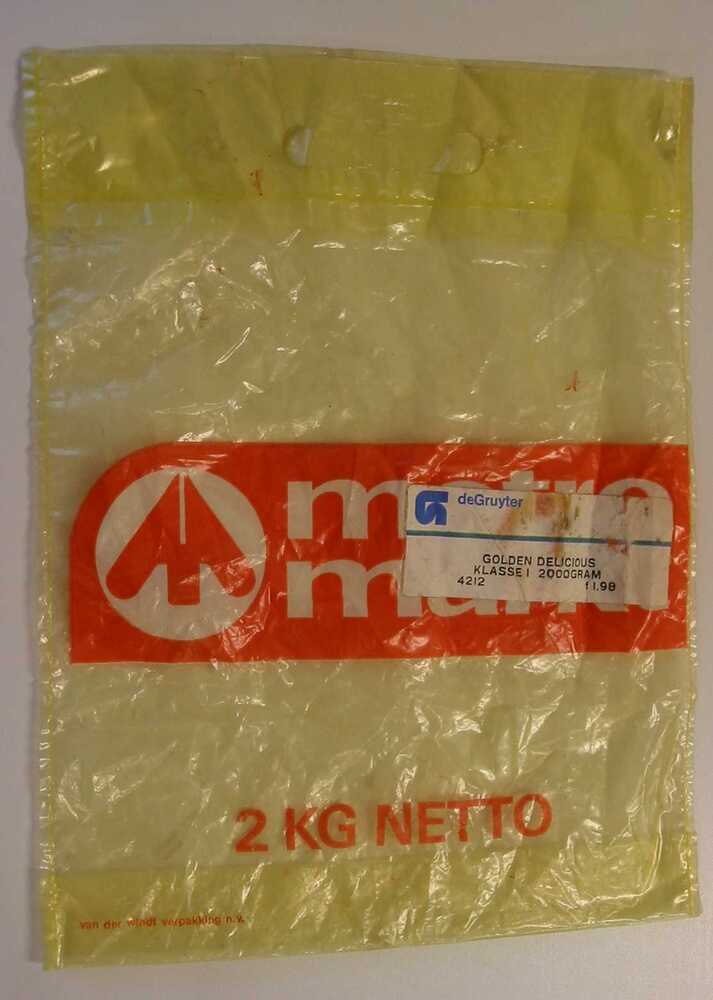- BeschrijvingGeel doorzichtig plastic draagtas. Over het midden van de voorzijde loopt een oranje streep met tekst, hierovereen is een sticker van De Gruyter geplakt. Midden voor onderaan staat nog de tekst: 2 KG NETTO en klein linksonder de vervaardiger van de draagtas.