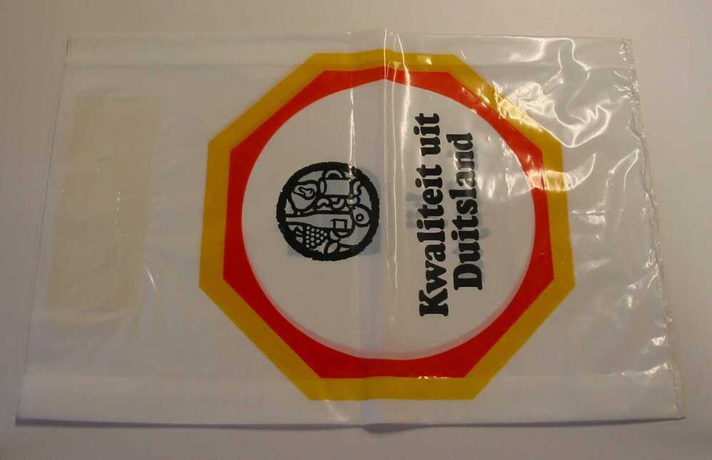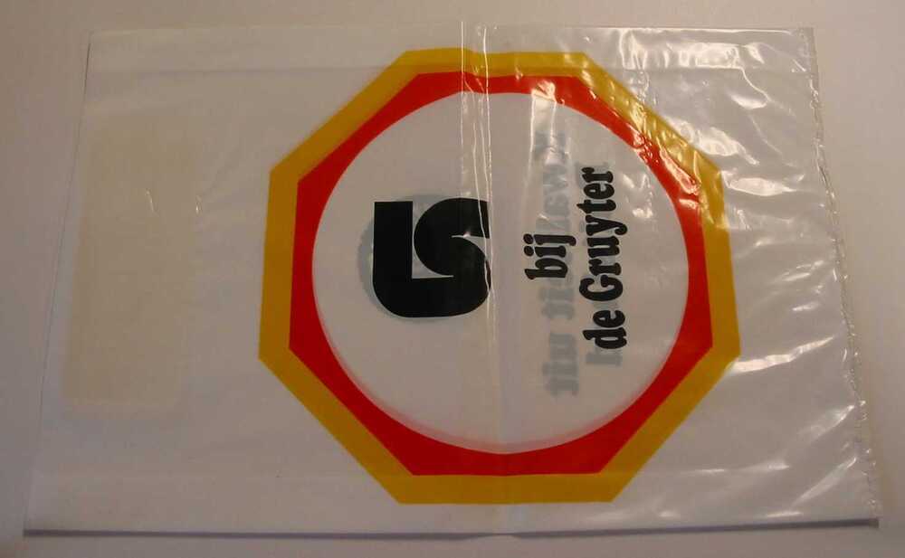 - BeschrijvingWitte plastic draagtas met achthoekige vorm in oranje en geel. Binnen deze vorm staat aan de voorzijde: G bij de Gruyter. Op de achterzijde binnen de achthoek staat een cirkel met levensmiddelen en daaronder de tekst: Kwaliteit uit Duitsland. De binnenvorm van beide achthoeken zijn rond en wit.