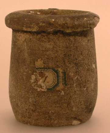 - BeschrijvingPotje van lichte grijze aarde, van binnen geel verglaasd (oude kaart) - vlakke bodem, geen voet - enigszins ovaal lichaam - insnoering onder platte, afgeronde bindrand - geel loodglazuur aan binnen- en buitenkant, dat aan de buitenkant grotendeels afgesleten is