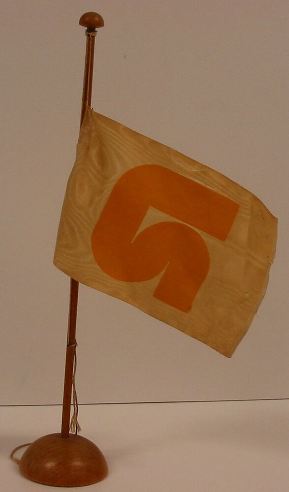- BeschrijvingGeel vlaggetje met logo De Gruyter op houten stokje. Logo is een gestileerde, vierkante G. Vlaggetje zit bevestigd met touwtje dat via een spijker aan het stokje vast zit. Stokje staat op een ronde voet.