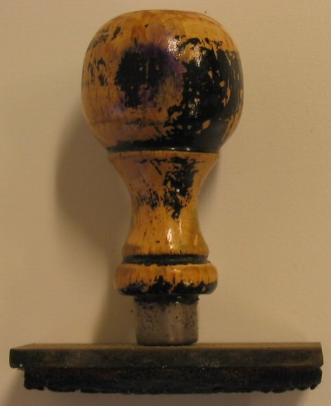 - BeschrijvingRubberen stempel met een houten handvat. Het rubber is bevestigd op metaal en dat metaal is weer verbonden aan het houten handvat. Op de stempel staat het adres van De Gruyter N.V.in Arnhem. Het handvat loopt naar boven toe in een bolvorm en heeft sierranden.
