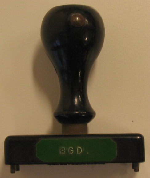 Rubberen stempel met een zwart houten handvat. Op de stempel staat 'bedrijfsgeneeskundige dienst P. de Gruyter en Zoon N.V. 's-Hertogenbosch. Aan de zijkant zit een groen stickertje. Het handvat loopt naar boven toe in een bolvorm. Aan de onderzijde zit in elk hoek een pinnetje waar de stempel op kan steunen. Wil je iets stempelen dan druk je deze pinnen mee in.