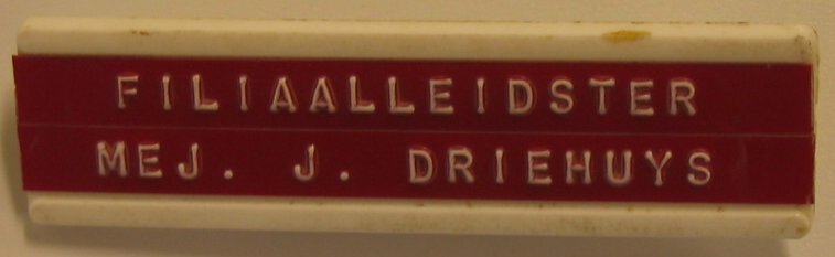 - TitelNaamplaat van een filiaalleidster van De Gruyter