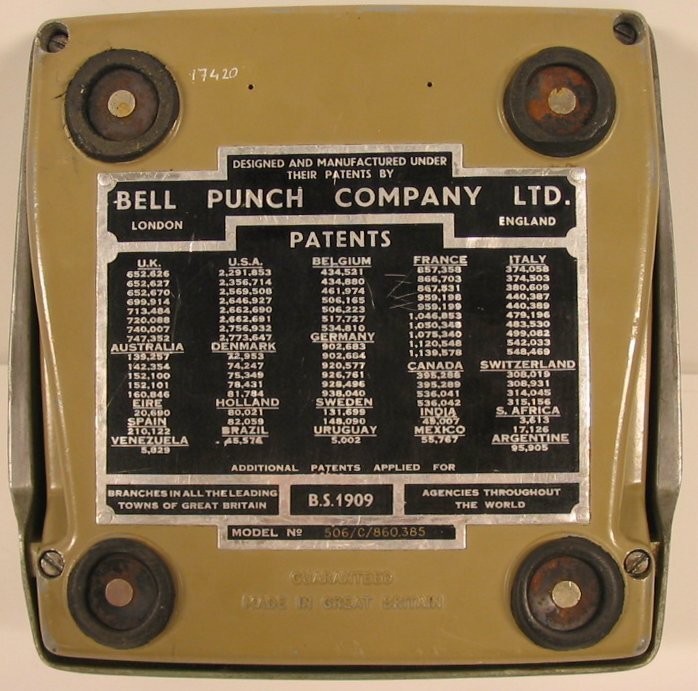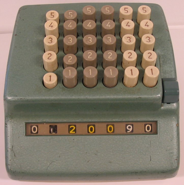 Telmachine 'Plus' van De Gruyter. De ombouw is blauw/groen van kleur. Op de achterzijde staat met grote letters PLUS. Op de bovenkant zitten 6 verticale rijen witte en grijze knopjes met de cijfers 1 tot en met 5. Je kunt met dit apparaat alleen bedragen optellen. Voor het cijfer 9 toets je een 5 en een 4 in.