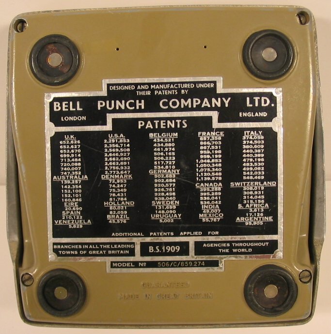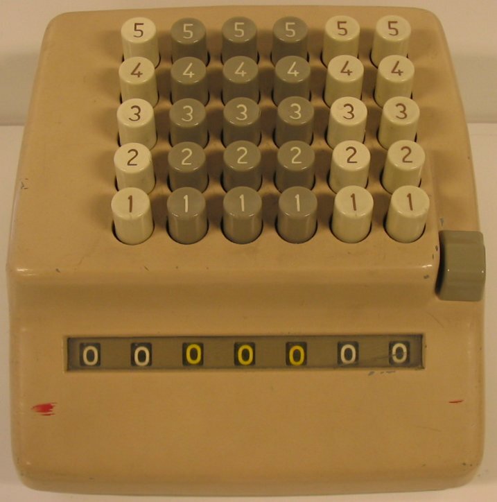 Telmachine 'Plus' van De Gruyter. De ombouw is beige van kleur. Op de achterzijde staat met grote letters PLUS en PROVENTO. Op de bovenkant zitten 6 verticale rijen witte en grijze knopjes met de cijfers 1 tot en met 5. Je kunt met dit apparaat alleen bedragen optellen. Voor het cijfer 9 toets je een 5 en een 4 in.