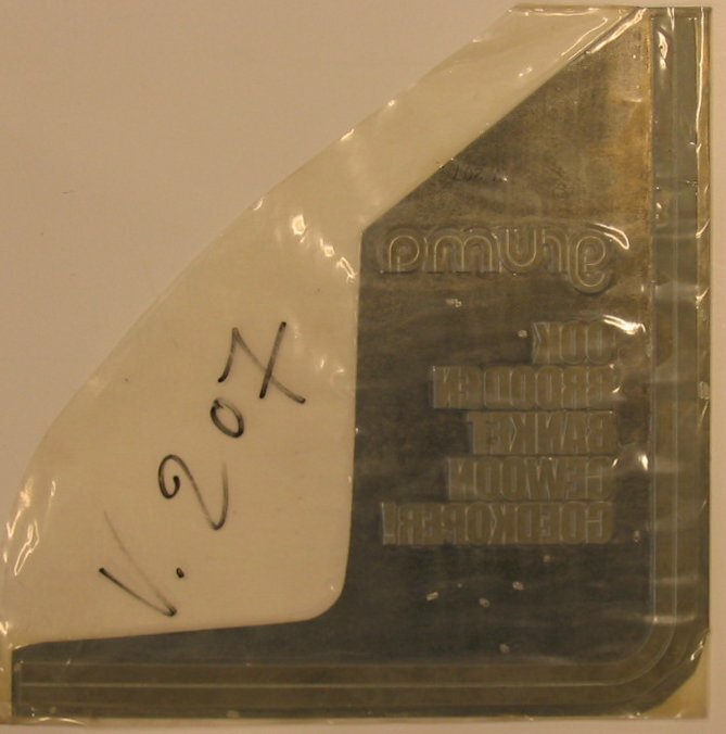 Metalen drukplaat met de teks GRUMA OOK BROOD EN BANKET GEWOON GOEDKOPER!