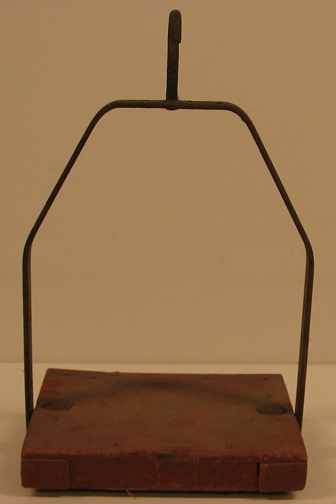 Rode houten weegplankje behorende bij weegschaal van De Gruyter.