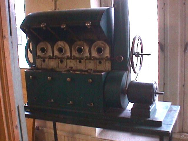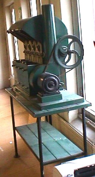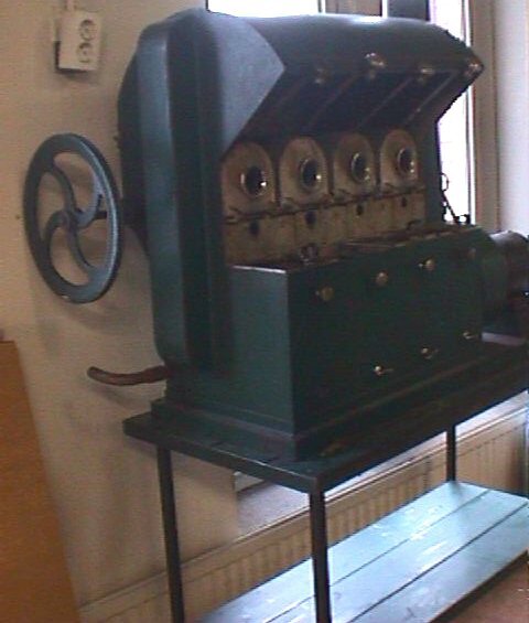 Koffiebrander van De Gruuyter op onderstel. Dit onderstel is groen geverfd en is van hout en metaal. De machine is van metaal en groen geverfd. Op de achterzijde staan ook nog een verticale rode en gele streep geverfd. Er zitten vier bakjes in, waarvan je de deksel (zeef) kunt optillen. Een zeefje ontbreekt. Boven die bakjes zitten metalen bussen die je door middel van scharnieren kunt leeg gieten in de bakjes. Aan de linkerzijde zit een aandrijfwiel en aan de rechterzijde zit een wiel met een leren band. Onder aan de voorzijde steken een soort van draaiknopjes waaraan een stangetje dwars door de machine gaat. Een van die stangetjes is eruit en ligt er los bij.