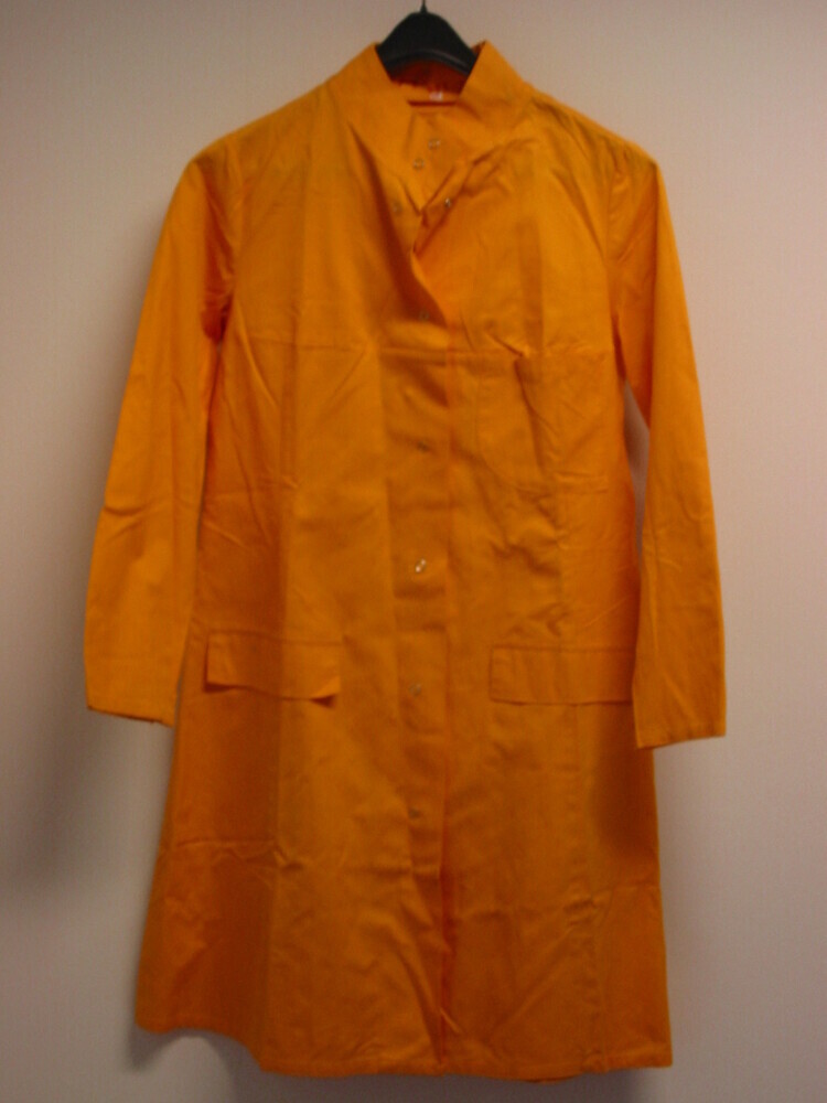 - BeschrijvingJasachtige gele winkelschort met metalen drukknoopjes. De knoopjes lopen in een rij over de schort, twee knoopjes zitten op de kraag. Op de voorzijde zitten twee nepzakken en een echte borstzak. Het voorpand bestaat uit zes stukken en het achterpand uit drie.
