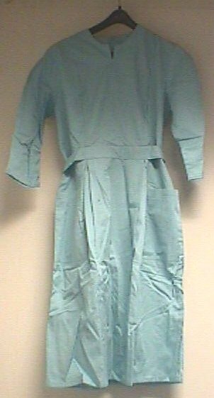 - BeschrijvingBlauwe jurk met ceintuur, twee zakken en sluiting met 5 knopen aan achterzijde. Waarschijnlijk gebruikt in winkel of fabriek van De Gruyter.