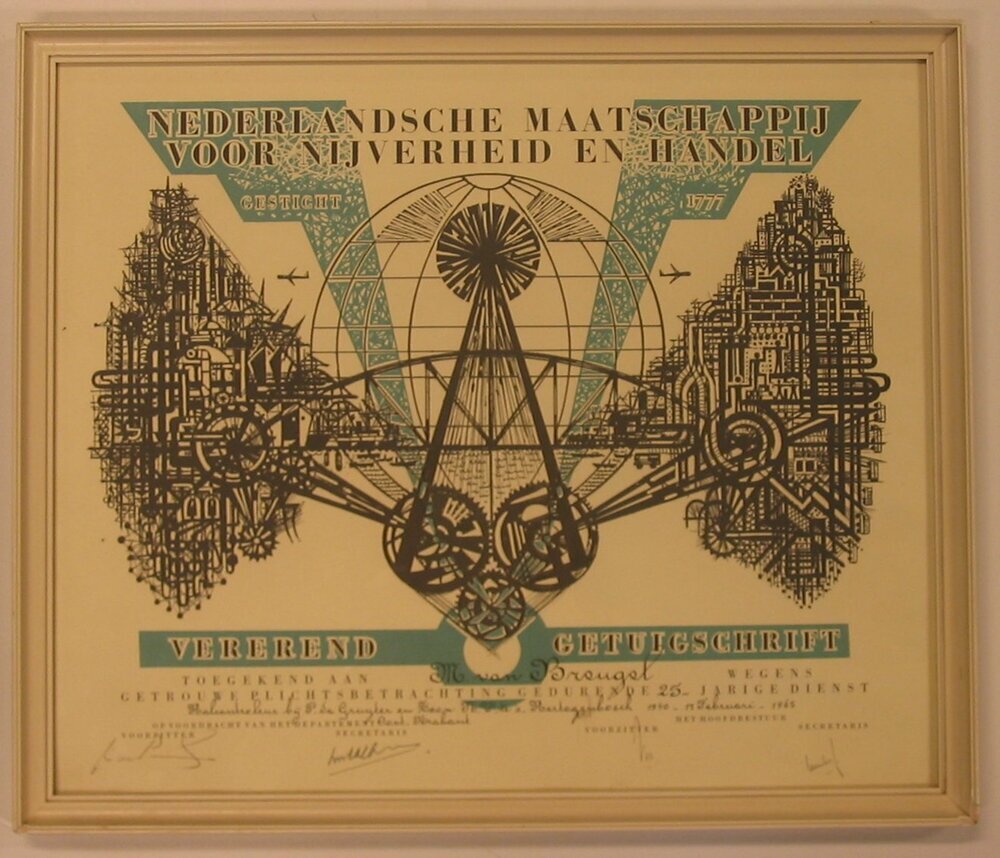 - BeschrijvingGetuigschrift van de Nederlandsche Maatschappij voor Nijverheid en Handel toegekend aan M. van Breugel wegens getrouwe plichtsbetrachting gedurende 25 jarige dienst als halcontroleur. Het getuigschrift is ingelijst in een houten wit gelakte lijst.