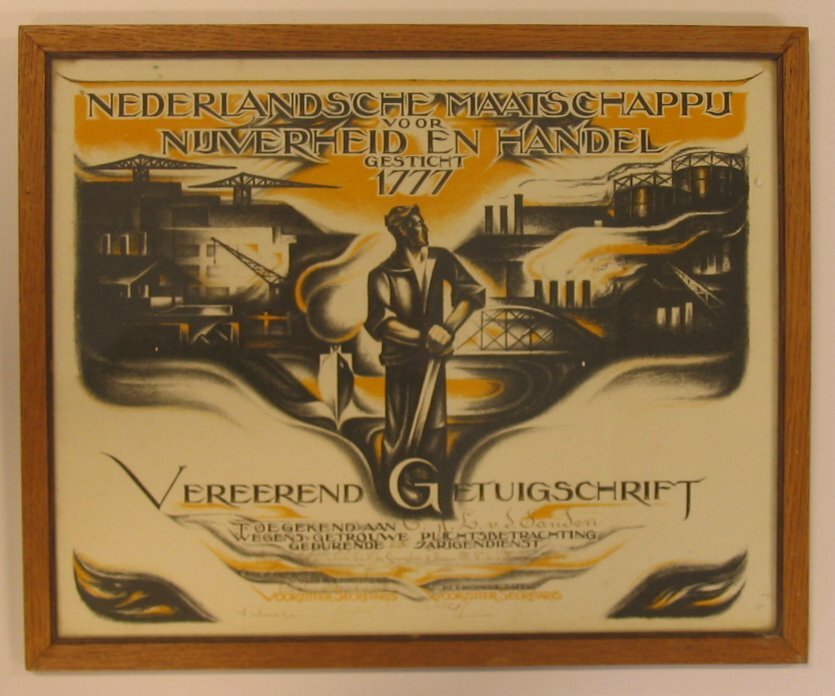 - BeschrijvingGetuigschrift van de Nederlandsche Maatschappij voor Nijverheid en Handel toegekend aan G.J.L. v.d. Sanden wegens getrouwe plichtsbetrachting gedurende 25 jarige dienst als rayonchef winkels. Het getuigschrift is ingelijst in een houten lijst.