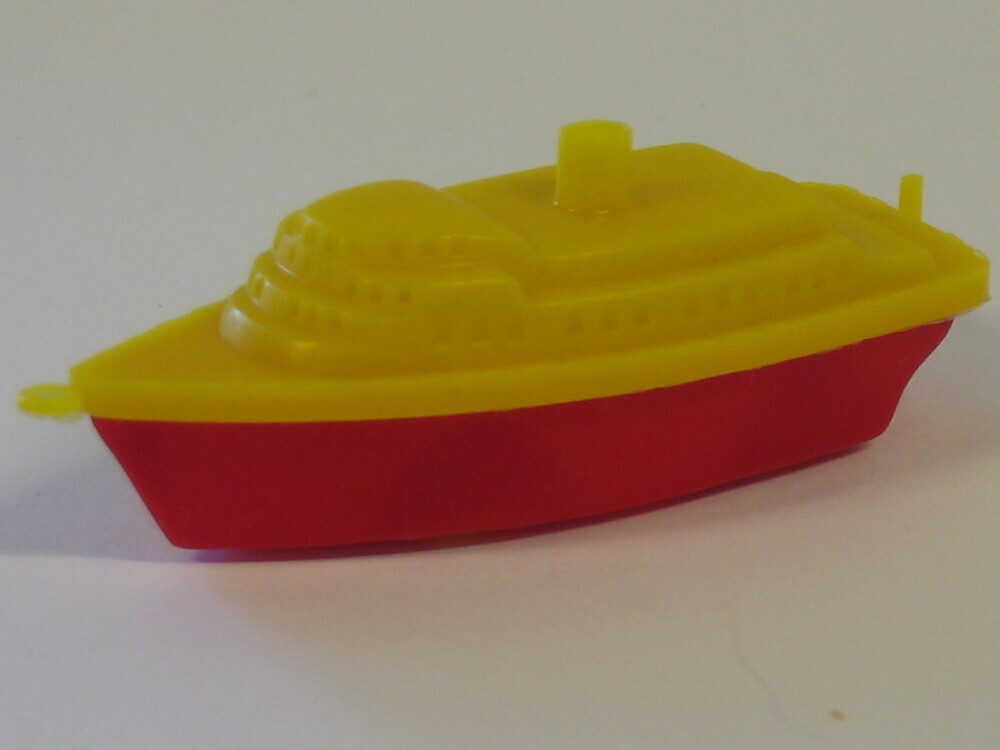 Bootje op wielen met een verhoogd dek en een schoorsteen in het midden