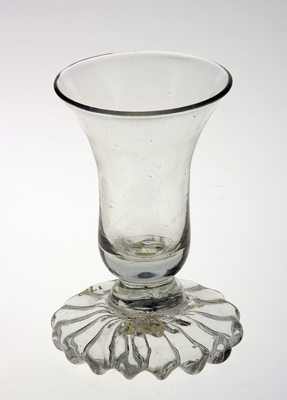 - BeschrijvingZware gedoomde voet met geschubde onderzijde. Klokvormige cuppa. Het glas wordt op de oude inventariskaart een vrijmetselaarsglas genoemd.