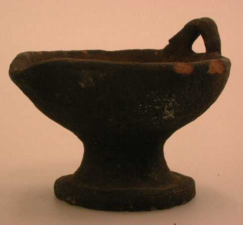 - Beschrijving- platte voet - standring - insnoering boven voet - schotelvormig oliebakje met tuitje, en naar boven uitstekend ophangoog - behalve de binnenkant van de schotel is het lampje grotendeels zwart