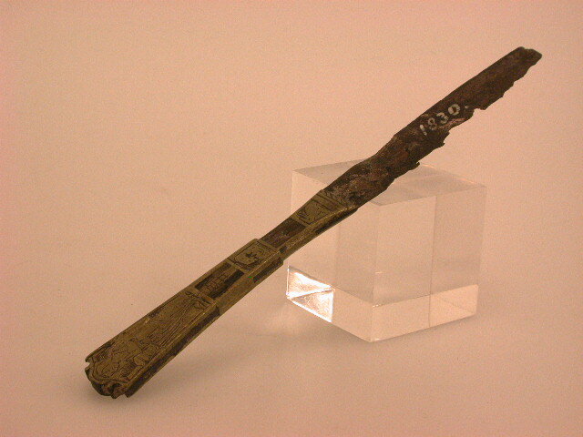 - BeschrijvingIJzeren mes met koperen heft. Heft versierd met gegraveerde voorstellingen van St. Magdalena en St. Barbara. Mogelijk Bosch' fabrikaat.